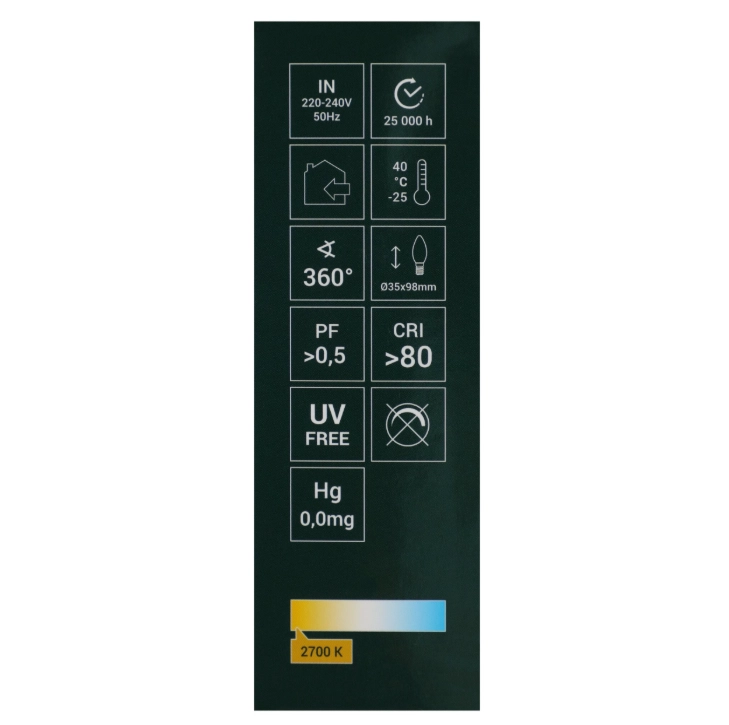 - Kształt: C35 – klasyczny, elegancki design pasujący do lamp dekoracyjnych.