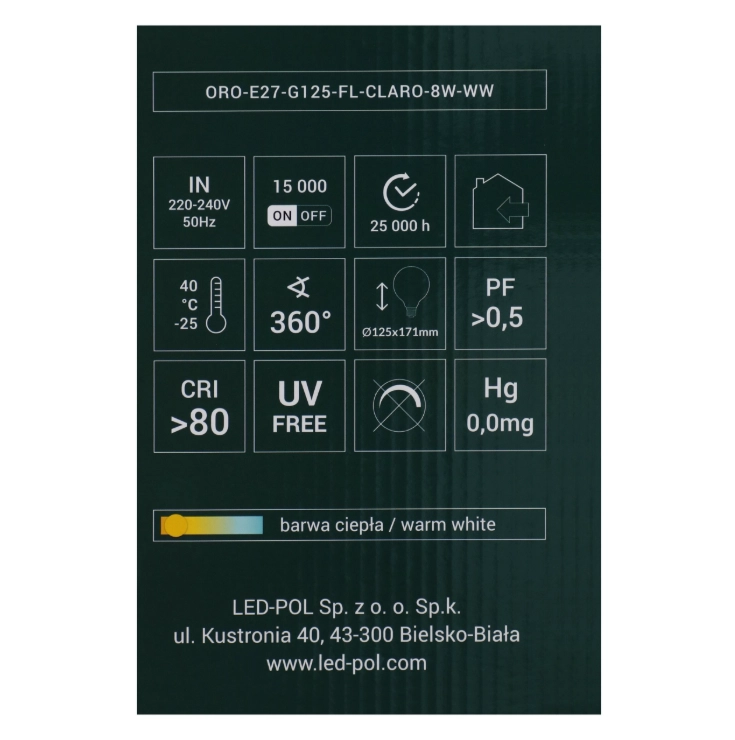 Żarówka ORO CLARO E27 G125 8W WW LED-POL