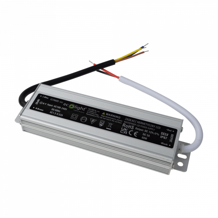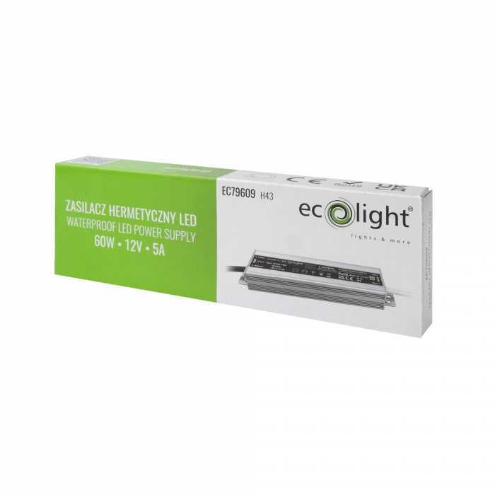 Hermetyczny zasilacz LED ECOLIGHT 60W, 12V DC, 5A, wymiary 180x40x22 mm. Odporność na wilgoć i kurz, stabilne zasilanie taśm i modułów LED. Model EC79609.
