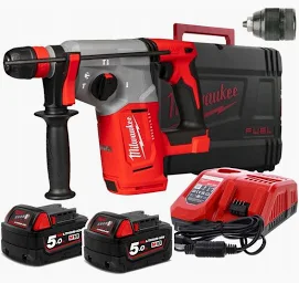 Milwaukee M18 BLH-0 + M18 B5 to wydajna młotowiertarka akumulatorowa SDS-Plus 18V w zestawie z akumulatorem 5.0 Ah, przeznaczona do prac budowlanych i montażowych.